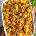 This dish takes the classic mac and cheese that everyone knows and loves and elevates it with tender shredded chicken coated in tangy BBQ sauce. The result? A smoky-sweet twist that balances the richness of the cheese sauce with bold barbecue flavors. Add crispy fried onions and fresh parsley on top, and you have a dish that’s just as eye-catching as it is delicious.