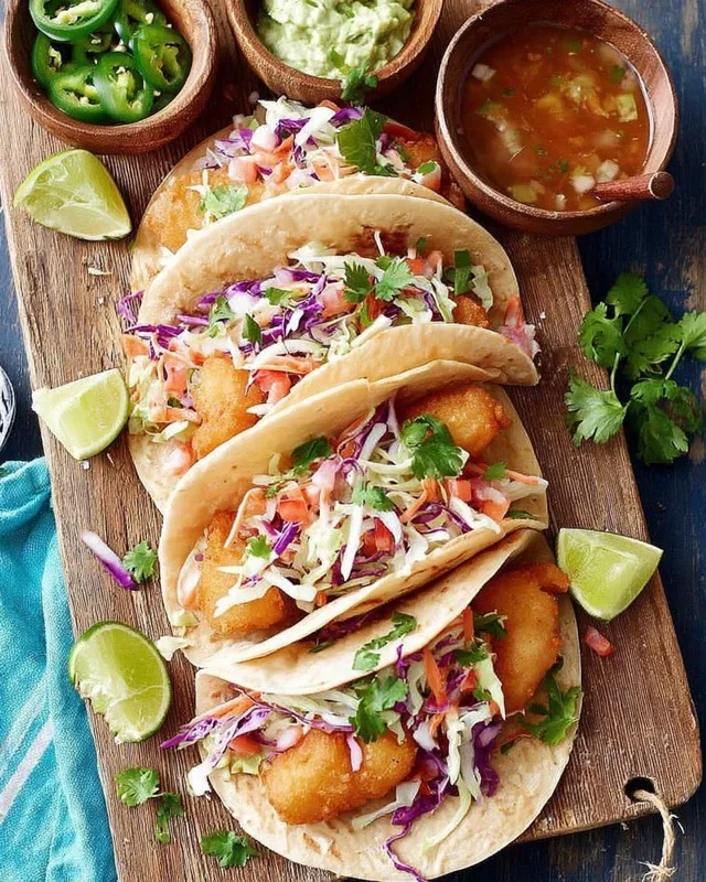 - Assemble the tacos – Layer crispy fish on each tortilla, top with cabbage slaw, and finish with your favorite toppings.