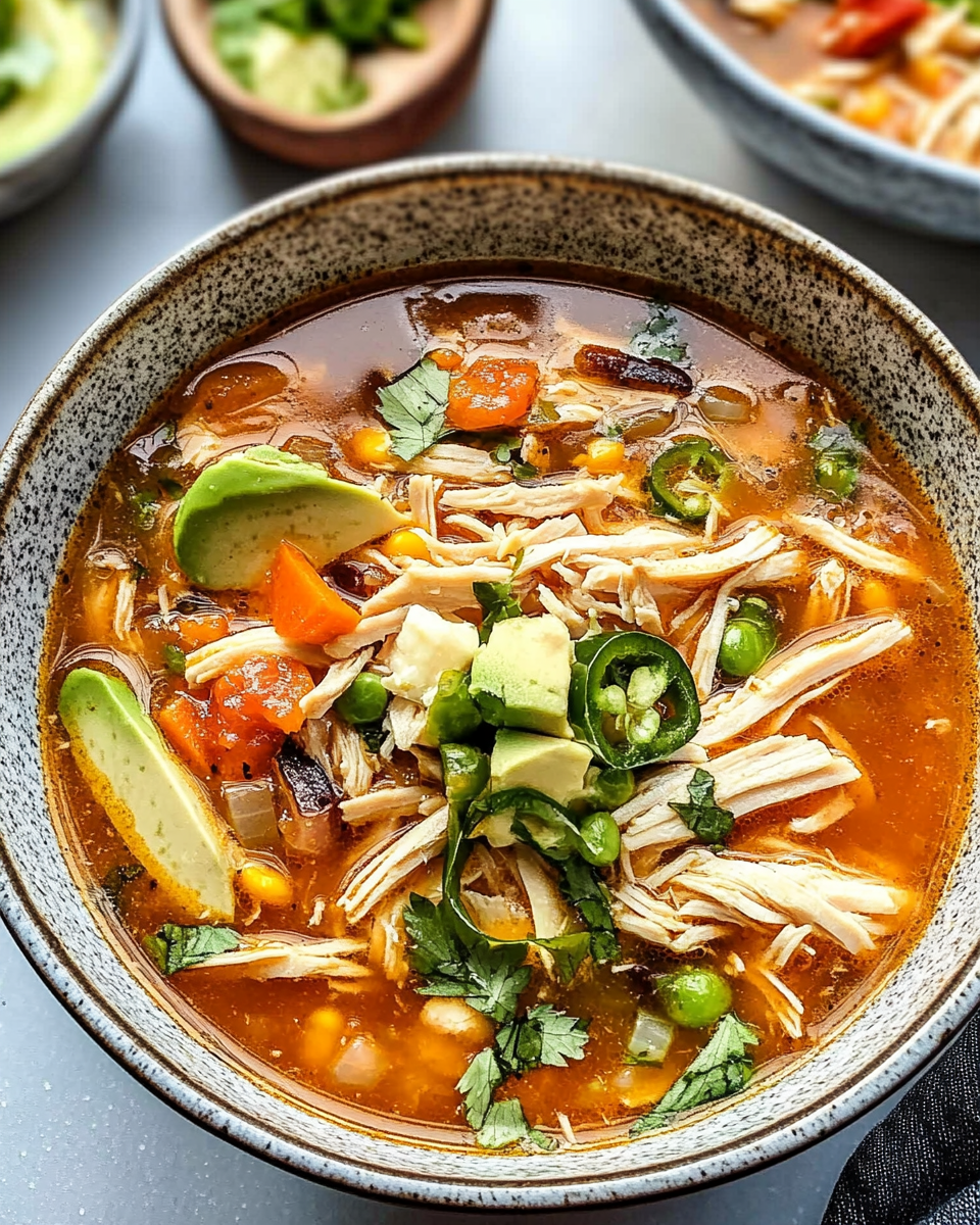 Serve the chicken tortilla soup immediately while hot, encouraging everyone to add their chosen toppings to personalize their bowls. The vibrant colors and aromas will entice your guests, providing a delightful dining experience centered around a comforting, flavorful dish.